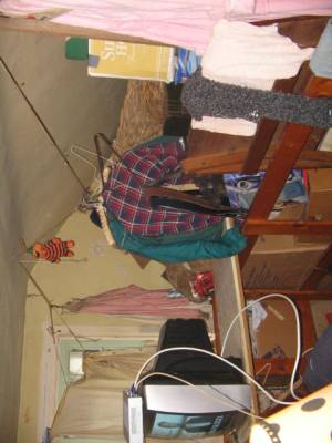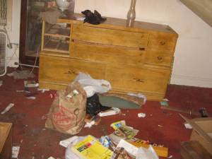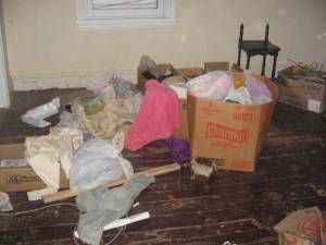 The house I bought was not as bad as some of the houses you see on Hoarders, at least the whole house wasn’t.   But the third floor attic bedroom was as bad as those hoarders’ houses.  This is where the man who I call PissMan, his girlfriend and their cat (sans litter box) stayed.  The cat just relieved itself on all the stuff up there — clothes, cardboard boxes, etc.  I needed this room to be a bedroom for two of my kids.  It had to be completely transformed.
